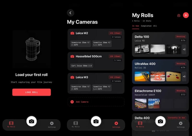 Приложение имеет диапазон фокусного расстояния от 28 мм до 200 мм и накладки соотношения сторон для форматов 135 и 120. Фотографы могут вести предварительный обзор и записывать настройки для своей пленочной камеры, а в будущем приложение планирует возможность загружать сканы и автоматически связывать их с журналом съемок.