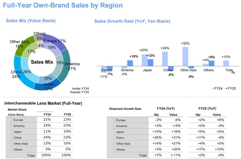 Интересно, что кроме объектива собственного производства, Tamron также выпускает объективы для OEM-партнеров, что становится важной частью их бизнеса. В 2025 году 59% проданных объективов были под брендом Tamron, тогда как доля OEM составила 41%.