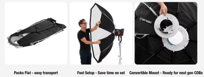 “Snap Rabbit Octa 5 Snapbag отличается супер-плоским дизайном, магнитными замками и новой системой Convertible Mount для быстрой смены между NL, Bowens и Aputure A-Mount. Плавный свет, опциональная внутренняя диффузия, компактная упаковка для транспортировки и дополнительные 40° Snapgrid для управления направлением света — всё это сделано для современных LED-рабочих процессов,” - заявляют разработчики.