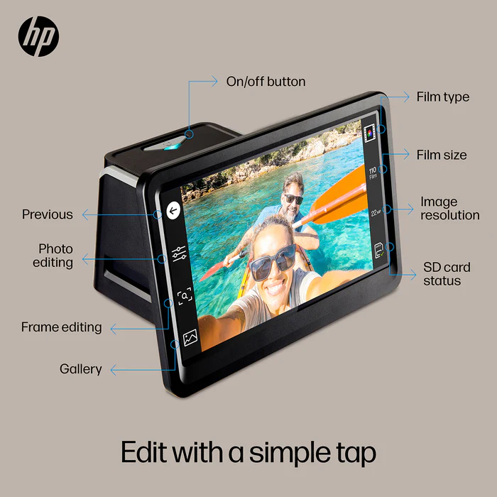 В дополнение к функции цифровизации, HP FilmScan включает встроенные инструменты редактирования, позволяющие пользователям корректировать размер изображения, яркость и цвет без использования стороннего программного обеспечения. Выбор типа пленки осуществляется непосредственно на сенсорном экране, что минимизирует сложные этапы настройки.