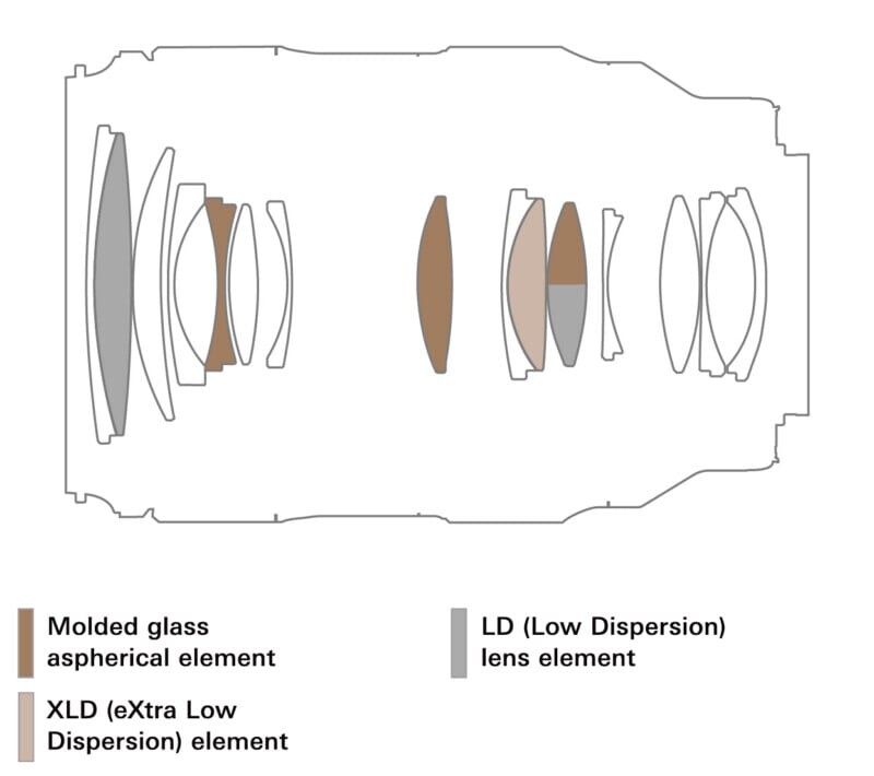 Оптическая схема включает 15 элементов в 13 группах и обеспечивает диафрагму с количеством лепестков девять. Она позволяет получать «богатый» боке и хорошую четкость изображения.
