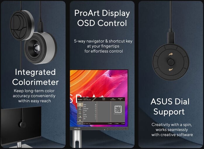 Устройство также включает функциональность Asus Dial, позволяя создавать настраиваемые ярлыки в поддерживаемых креативных приложениях. Используя Asus DisplayWidget Center, пользователи могут переключаться между режимами цветомера, OSD и диал-панели, а также настраивать ярлыки для своего рабочего процесса.