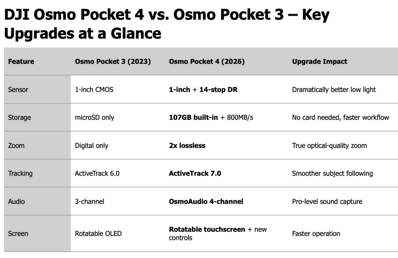 Сравнение Pocket 3 и Pocket 4 показывает, что хотя камера не кардинально изменится, улучшения в динамическом диапазоне и скорости передачи данных делают ее более привлекательной для творцов. Ожидаемая цена стартует от $500, и дата выхода намечена на 16 апреля 2026 года.