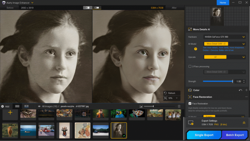 Aiarty поддерживает пакетную обработку, что позволяет восстанавливать сразу несколько изображений, особенно полезно для оцифрованных коллекций или проектных работ.