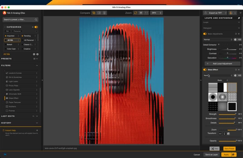 Nik Collection 9 также предлагает три новых творческих фильтра. Halation воссоздает оптический эффект сияния, типичный для пленочной фотографии, особенно вокруг ярких источников света. Chromatic Shift основан на ошибках регистрации цветных каналов, наблюдаемых в старых печатных материалах. Новый фильтр Glass предлагает более 50 текстур стекла, имитируя различные узоры и текстуры, через которые можно наблюдать изображение.