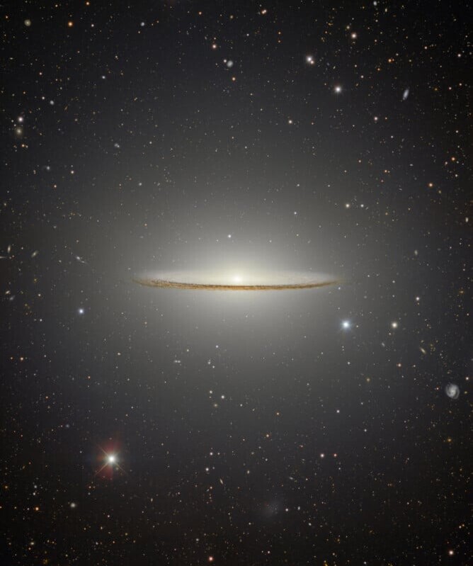 570-мегапиксельная камера Темной энергии направила свой 4-метровый телескоп на галактику Messier 104, более известную как Сомбреро, и запечатлела исключительный вид на эту галактику, иногда называемую "пыльной шляпой Вселенной".