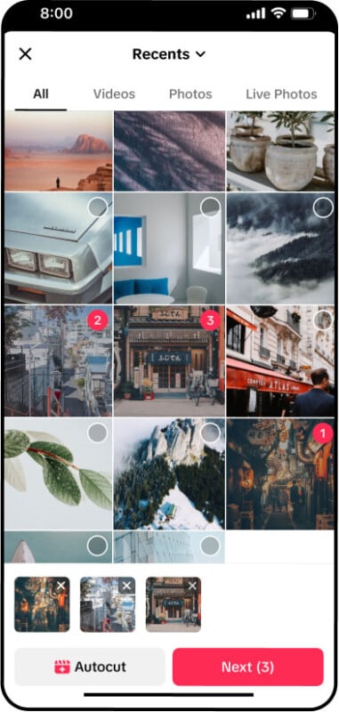 Несмотря на статус приложения, TikTok предлагает уникальные возможности для фотографов. В отличие от других платформ, здесь можно разместить до 35 фотографий в одном посте — на 15 больше, чем в Instagram. Чтобы поделиться своими снимками, достаточно нажать "Добавить пост (+)", затем выбрать "Фото" и загрузить изображения. Пользователи могут использовать фильтры, добавлять звук, текст и наклейки, а также обрезать фото перед публикацией.