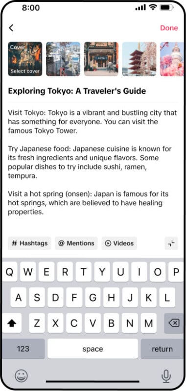 Описание поста под названием служит возможностью "дать зрителям представление о том, какую историю вы хотите рассказать". TikTok предлагает использовать 4000 символов, чтобы включить больше деталей и ключевых слов, которые помогут улучшить видимость поста.