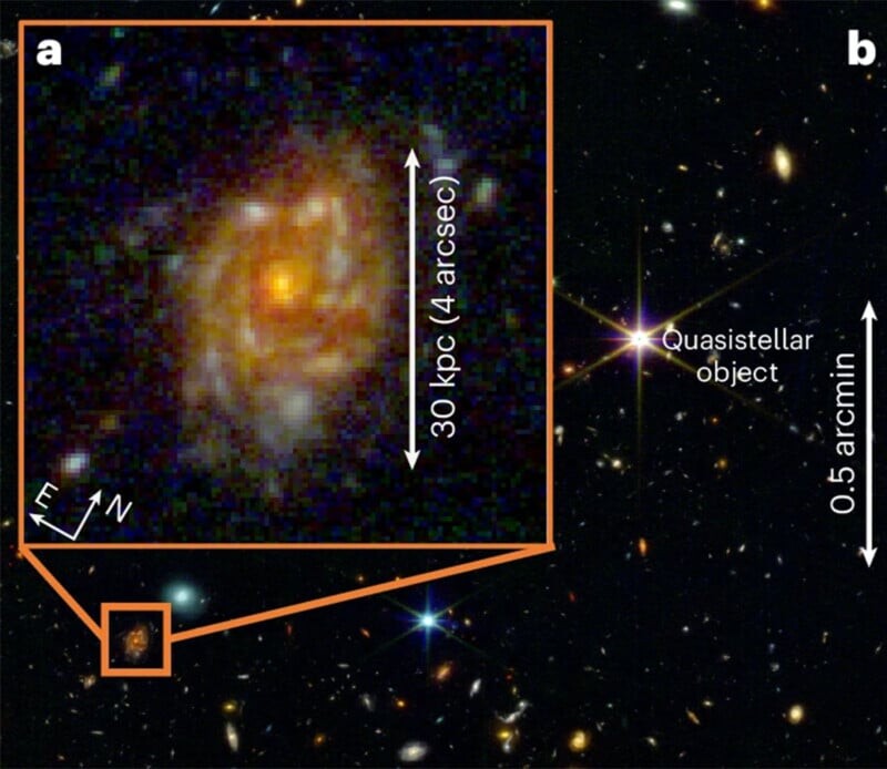 Исследование также утверждает, что это открытие ставит под сомнение существующие модели формирования галактик, так как условия в ранней Вселенной могли быть более благоприятными для создания таких гигантских структур, чем считалось ранее. Команда заметила галактику случайно, когда направляла телескоп на окрестности активного квазаря – мощного черной дыры.
