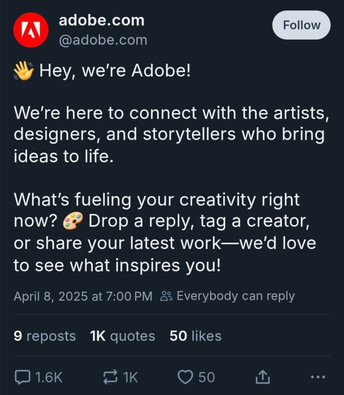 Первый пост Adobe на Bluesky, который привлек внимание, звучал довольно безобидно: "Эй, мы Adobe! Мы здесь, чтобы связаться с художниками, дизайнерами и рассказчиками, которые воплощают идеи в жизнь. Что вдохновляет вашу креативность прямо сейчас?" Однако этот пост вызвал бурную реакцию, и пользователи Bluesky немедленно начали высказывать свои жалобы на компанию.