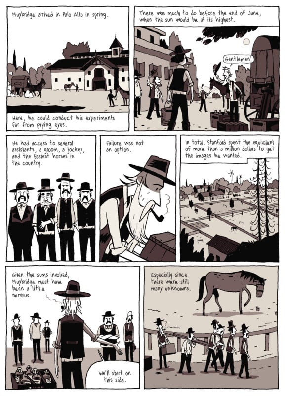 В комиксе описывается, как в 1870 году Муйбридж оказывается под давлением железнодорожного магната Леланда Станфорда, который хочет доказать, что копыта лошади не касаются земли в момент галопа. Эта задача становится пусковым механизмом для создания одного из величайших достижений, преобразивших мировую фотографию — изобретения таймлапс-фотографии и механического захвата движения.