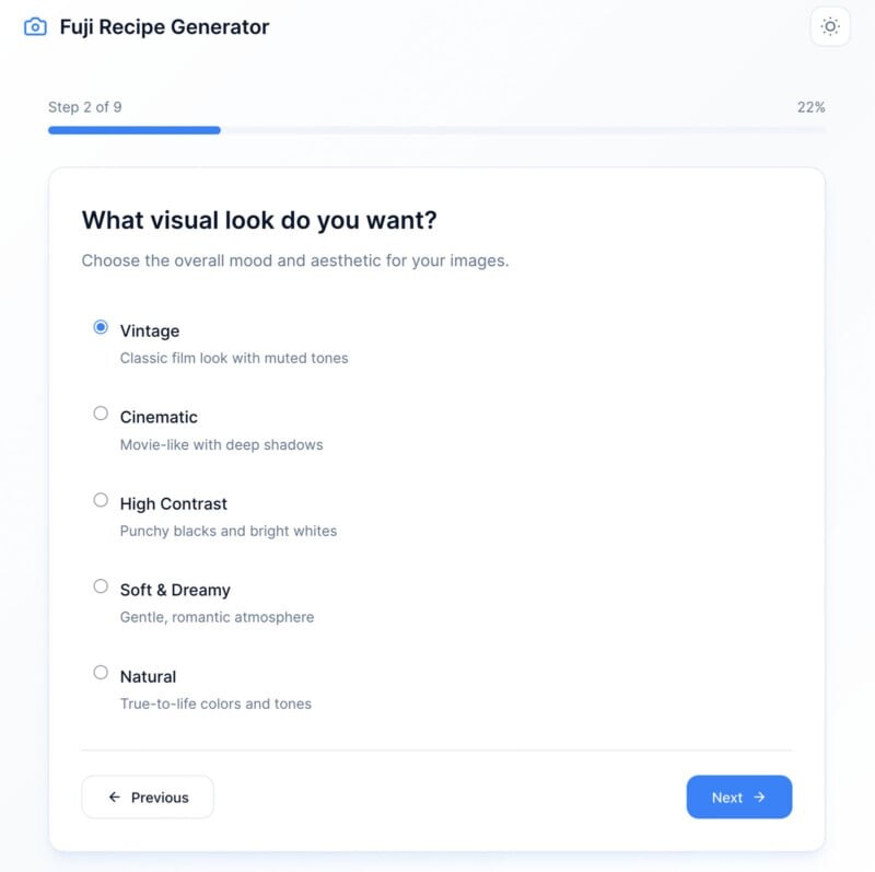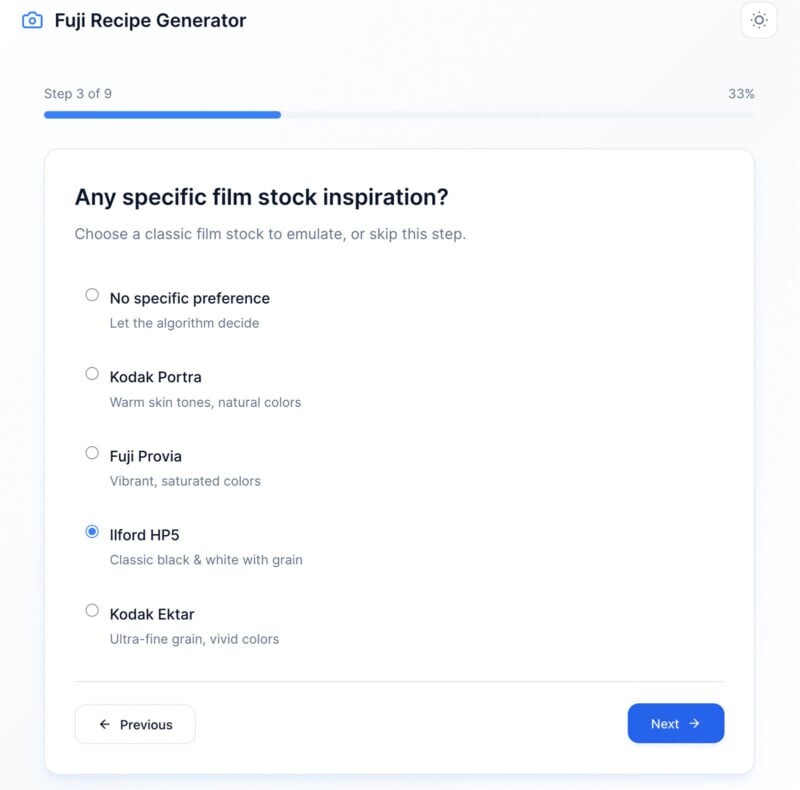 Пользователи могут выбирать из шести типов сенсоров, включая все поколения сенсоров Fujifilm X-Trans, а также последний 40-мегапиксельный X-Trans 5. После выбора камеру, фотографам необходимо ответить на ряд вопросов о желаемом визуальном виде, предпочитаемой киносъемке, условиях освещения и многом другом.
