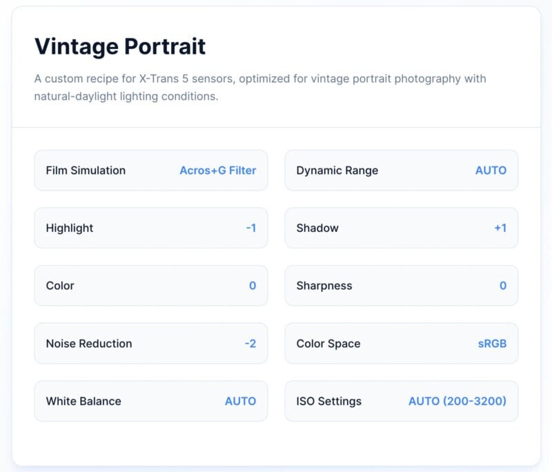 Новая бесплатная веб-приложение, разработанная фотографом Оливером Мандичем, позволяет владельцам камер Fujifilm создавать свои уникальные рецепты фильмов на основе желаемого эстетического звучания и того, какие объекты они обычно фотографируют. Fuji X Recipe Generator предоставляет интуитивно понятный интерфейс и развивается, чтобы фотографы могли сразу же начать экспериментировать.