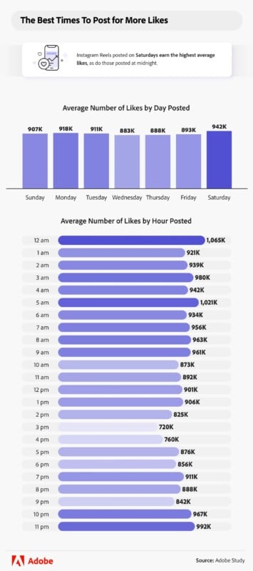 Тем не менее, Adobe подчеркивает, что не существует универсального лучшего времени для публикации в Instagram, так как оптимальная эффективность варьируется в зависимости от категории контента. Например, Рилс, посвященные фотографии, получают наибольшее число лайков, если размещены в 7 вечера по пятницам, а 6 утра во вторник демонстрирует высокие показатели просмотров.