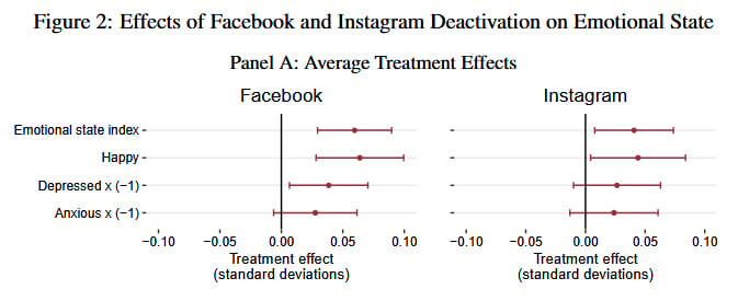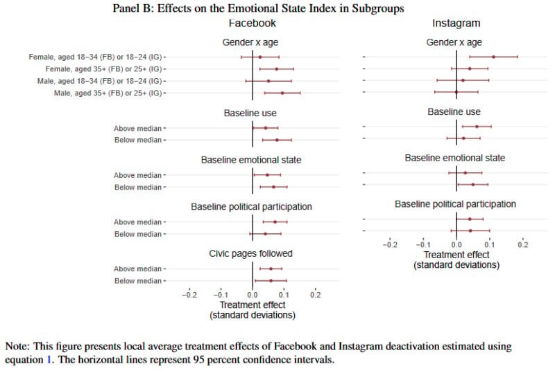 Результаты показали, что деактивация Facebook улучшила эмоциональное состояние на 0,060 стандартных отклонений, в то время как деактивация Instagram дала прирост на 0,041. Эти улучшения были более выражены у лиц старше 35 лет для Facebook и у молодых женщин младше 25 лет для Instagram. Оказалось, что использование платформы, а также возраст пользователей играют существенную роль в восприятии и влиянии социальных медиа на эмоциональное здоровье.