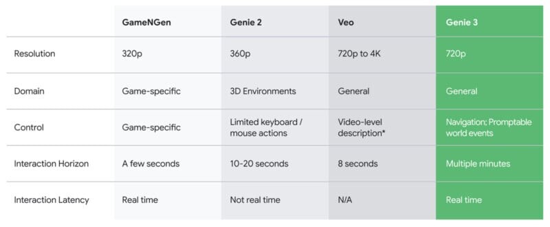 Genie 3 позволяет пользователям взаимодействовать с динамичными мирами в реальном времени с разрешением до 720p и 24 кадрами в секунду. Хотя это может показаться не слишком впечатляющим, Genie 3 стал значительным шагом вперед по сравнению со своими предшественниками. Например, Genie 2 ограничивался разрешением 360p и обеспечивал лишь минимальные действия в пределах сгенерированных искусственных миров.