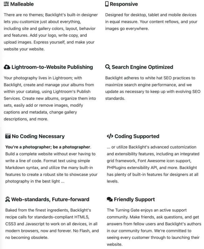 Несмотря на то, что Backlight ориентирован на фотографии, разработчики понимают, что многие фотографы также хотят включать текст на своих сайтах, будь то традиционные блоги — Backlight отлично работает с Wordpress — или фотоэссе. Backlight предлагает широкий спектр опций для любого рабочего процесса фотографа, от любителей, желающих поделиться своими изображениями, до профессионалов, управляющих бизнесом.