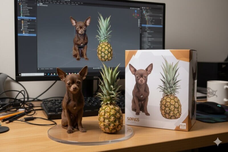 “Создайте коммерциализированную фигурку масштаба 1/7 из персонажей на фотографии в реалистичном стиле, в реальной среде. Фигурка расположена на компьютерном столе. У фигурки круглая прозрачная акриловая подставка, без текста на подставке. На экране компьютера показан процесс 3D-моделирования этой фигурки. Рядом с экраном компьютера находится упаковка игрушки, оформленная в стиле высококачественных коллекционных фигурок, напечатанной с оригинальным искусством.”