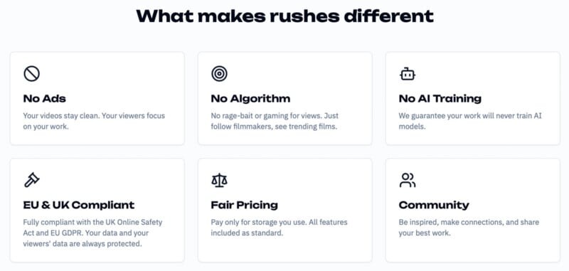 Команда Rushes подчеркивает, что платформа предназначена для защиты интересов независимых создателей: "Мы основаны в Европе, никогда не позволим искусственному интеллекту учиться на вашем творчестве и не являемся злой мега-корпорацией".