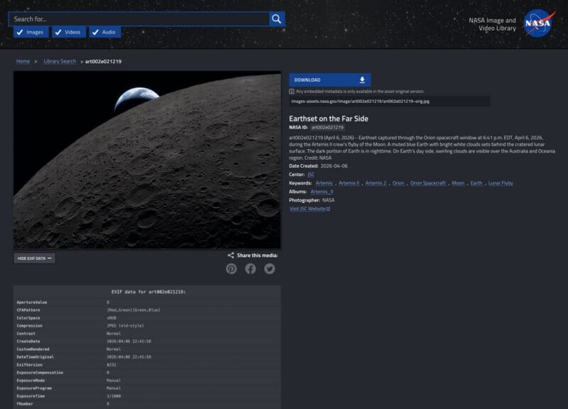 Но это еще не все. Существуют и другие платформы, например, images.nasa.gov, которая, в отличие от NASA Images и Изображения дня NASA, включает в себя детальные данные EXIF. В случае с миссией Artemis II эти данные были очень интересными, поэтому поиск изображений на images.nasa.gov стал предпочтительным подходом.