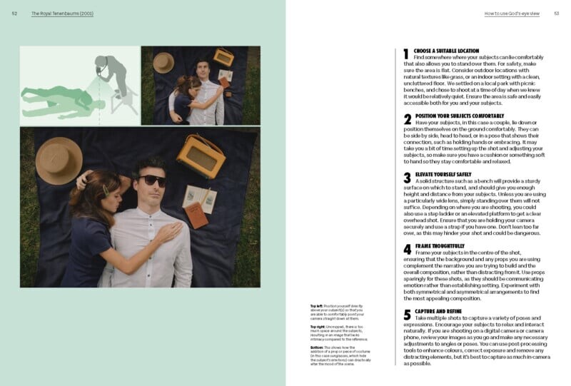 Книга подробно объясняет техники, лежащие в основе культовых фильмов Уэса Андерсона — от взгляда с высоты в «Королевских тененбаумах» до низкого ракурса в «Фантастическом мистере Фоксе» и симметрии в «Отеле Гранд Будапешт». Каждый раздел посвящен конкретному аспекту эстетики Андерсона и включает в себя иллюстрированные, пошаговые задания для фотографов.