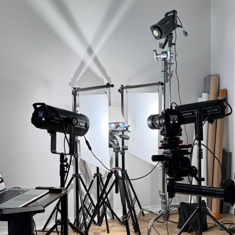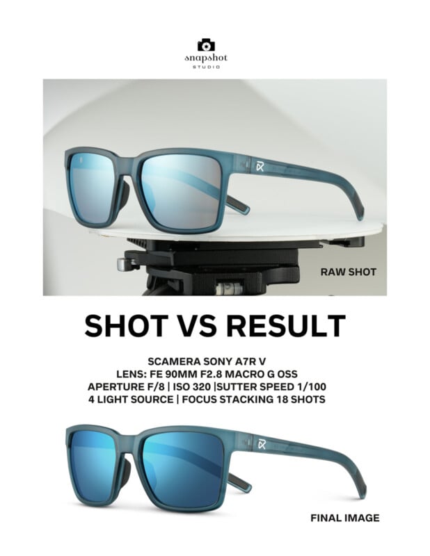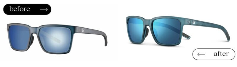 При съемке очков правильное освещение имеет ключевое значение. Живой пример: в первом варианте с неуправляемым освещением детали теряются, в то время как во втором варианте, при контролируемом освещении, использование диффузоров позволяет передать ясность и структуру.