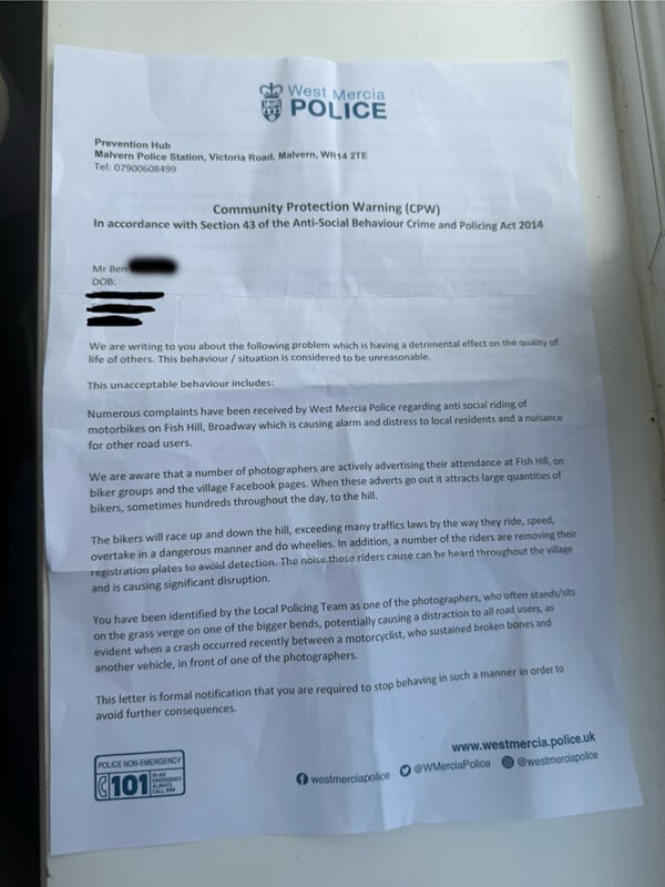 Полиция Вест-Мерсии официально предупредила три фотографа о запрете на съемку мотоциклистов на холме Фиш, расположенном в Уорчестершире, Англия. Это живописное место стало местом массовых сборищ мотоциклистов после того, как фотографы начали рекламировать свои фотосессии в интернете.