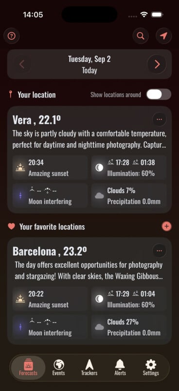 Solora – это универсальный планировщик погоды и астрономии. Он предлагает точные прогнозы погоды, включая облачность, осадки, ветер, видимость и температуру для любой точки мира. Персонализированные резюме позволяют пользователям оценивать качество восхода и заката, а также видимость ночного неба, что дает возможность заранее продумывать свои выезды.